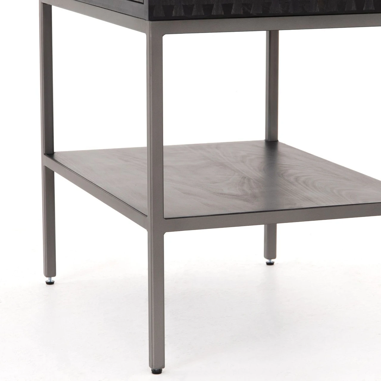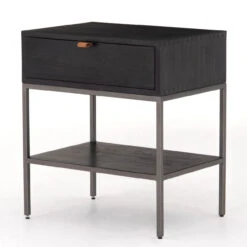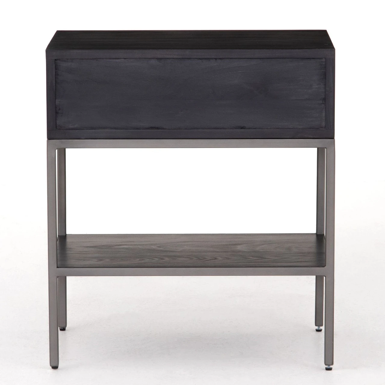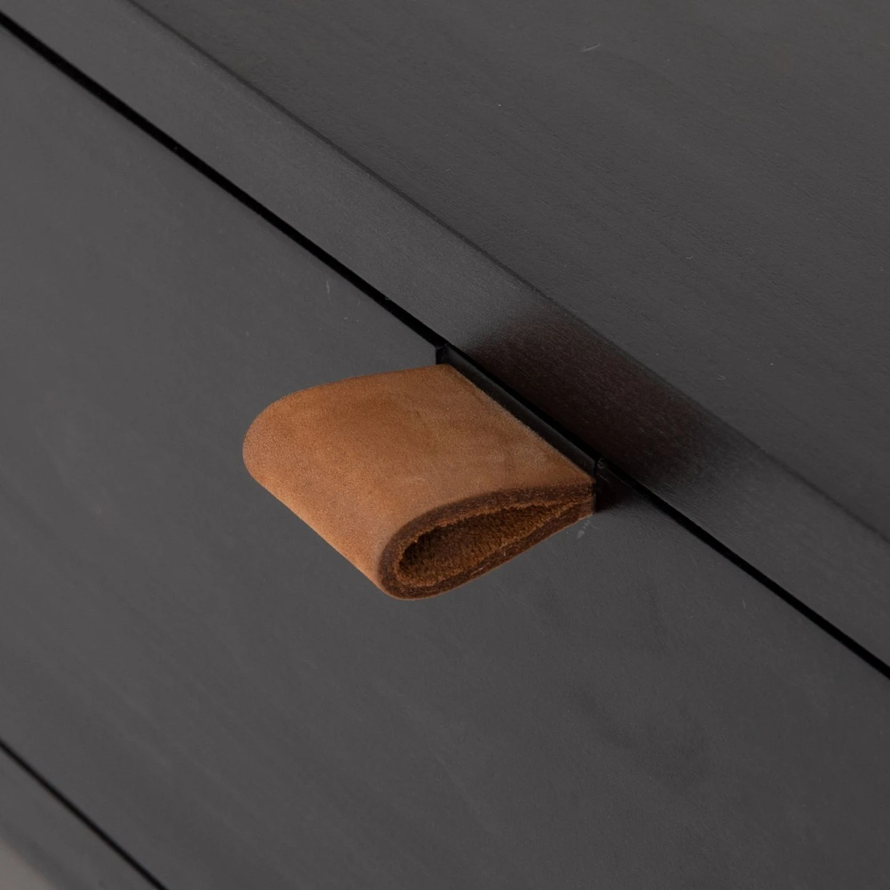 Inspired by clean mid-century design, a stylish nightstand of solid black/auburn-washed poplar brings extra space to bedside storage. Metal-secured leather pull adds a textural element of surprise.