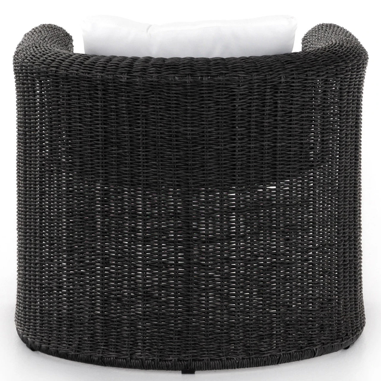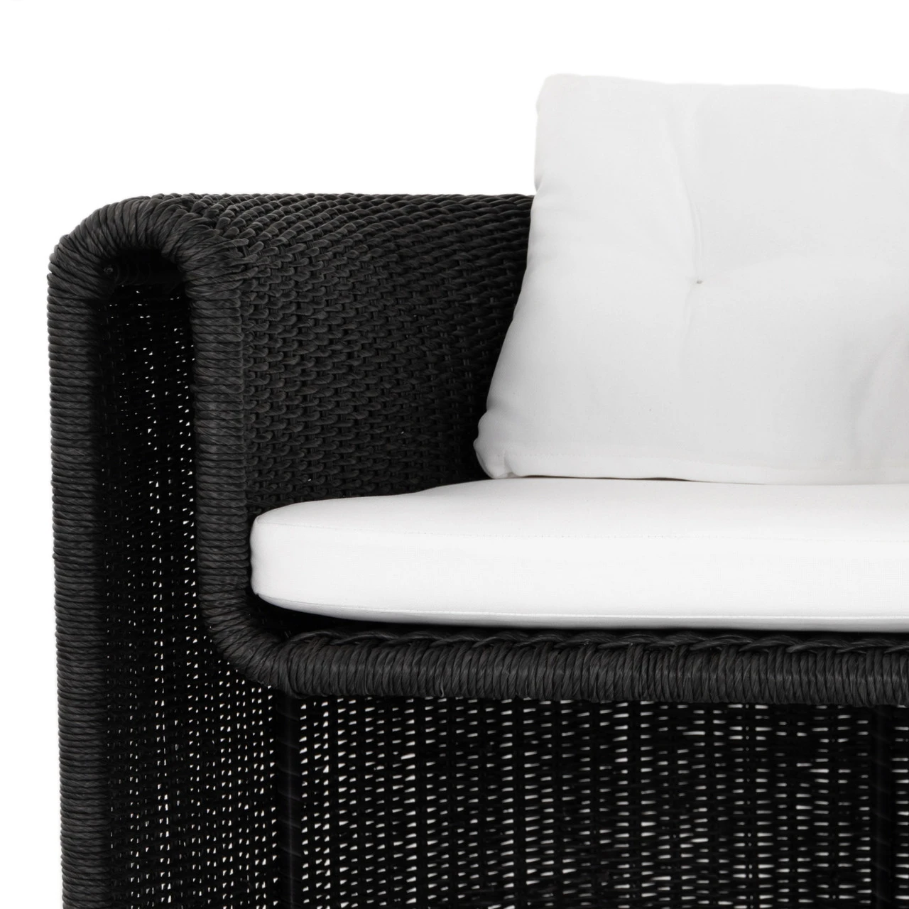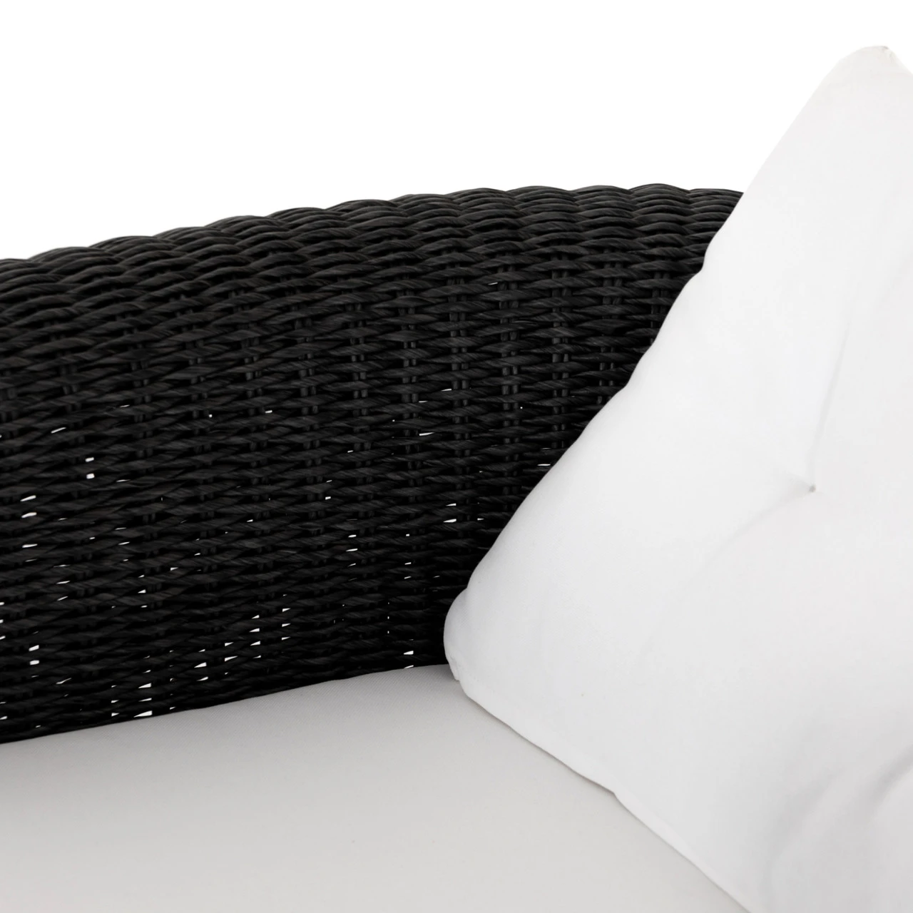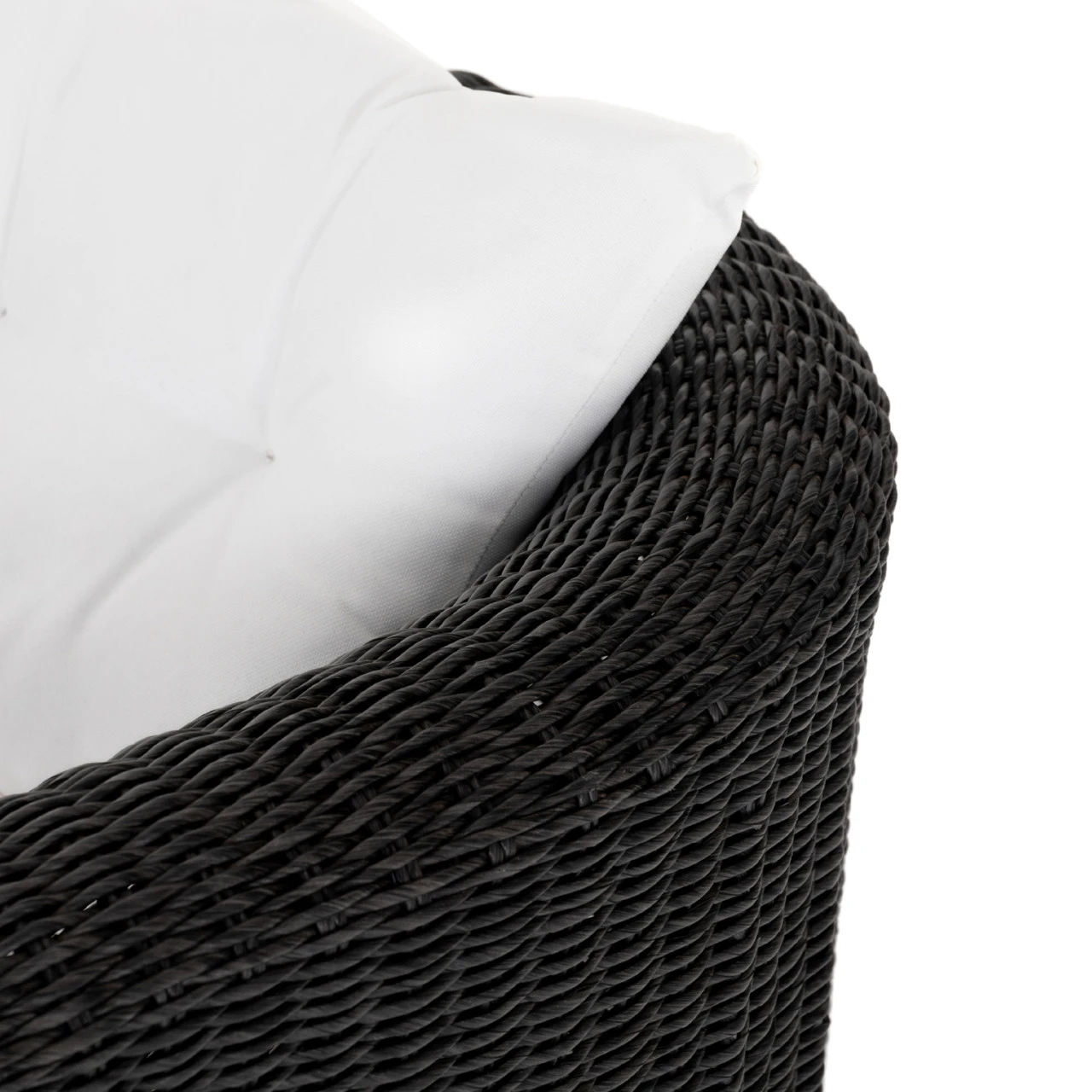 A nod to curvy Seventies styling, coal-colored wicker framing forms a fluid, sling-like shape with a waterfall arm, with durable tufted cushioning in a versatile white. Cover or store indoors during inclement weather and when not in use.