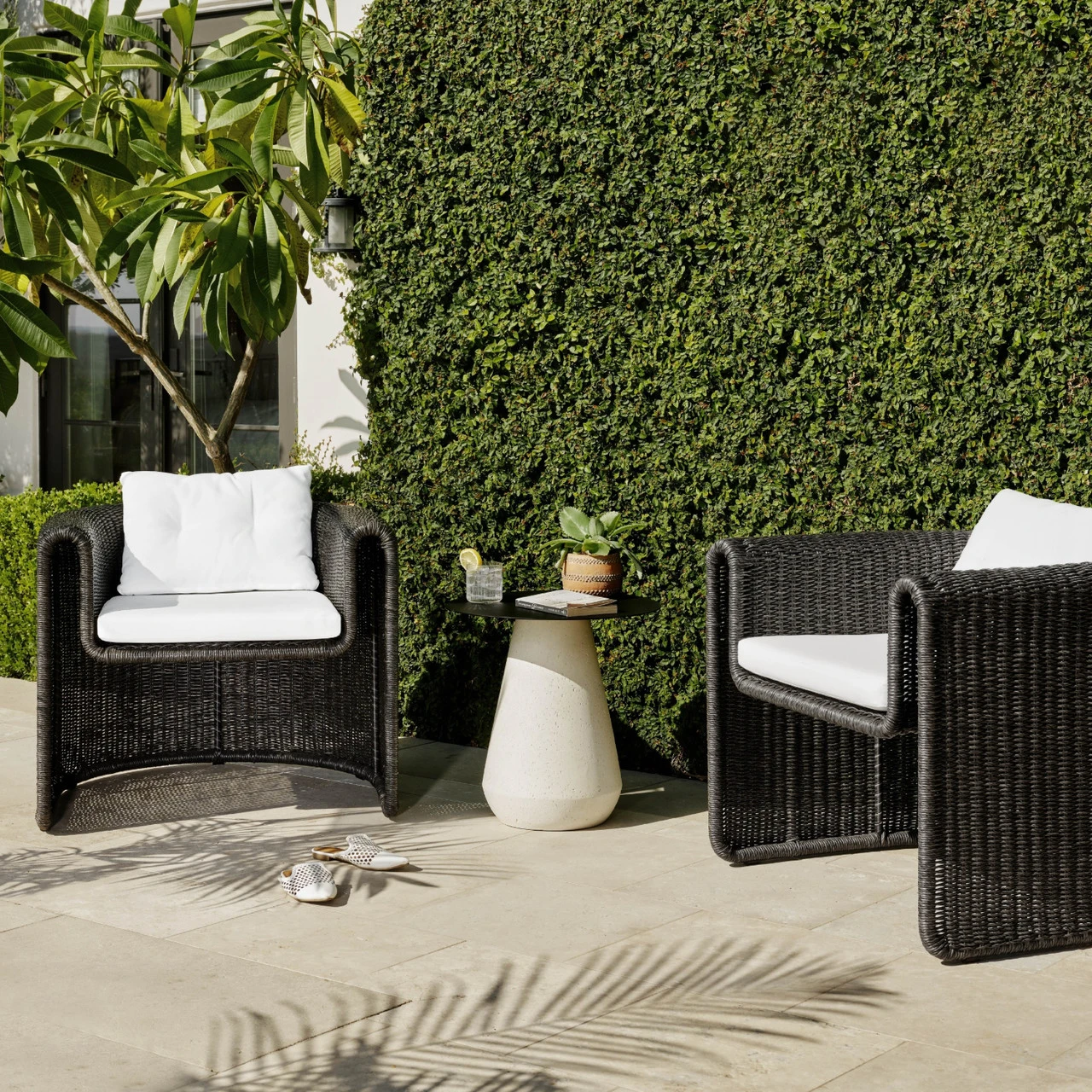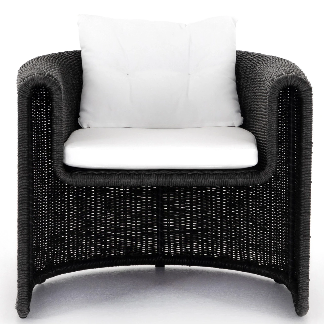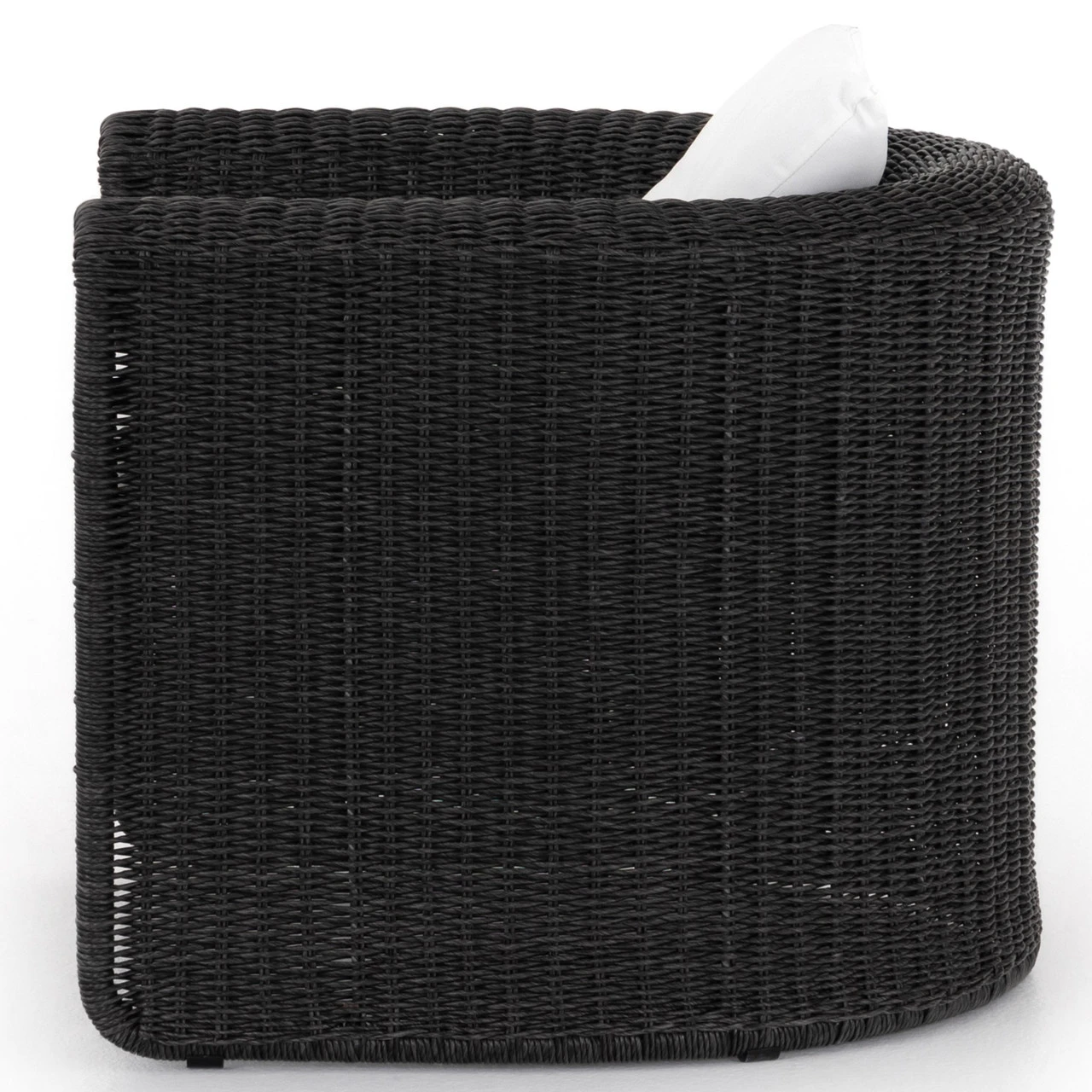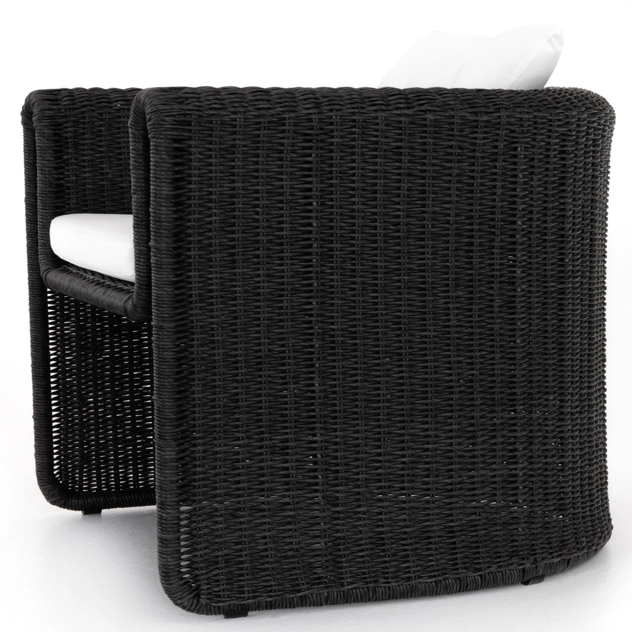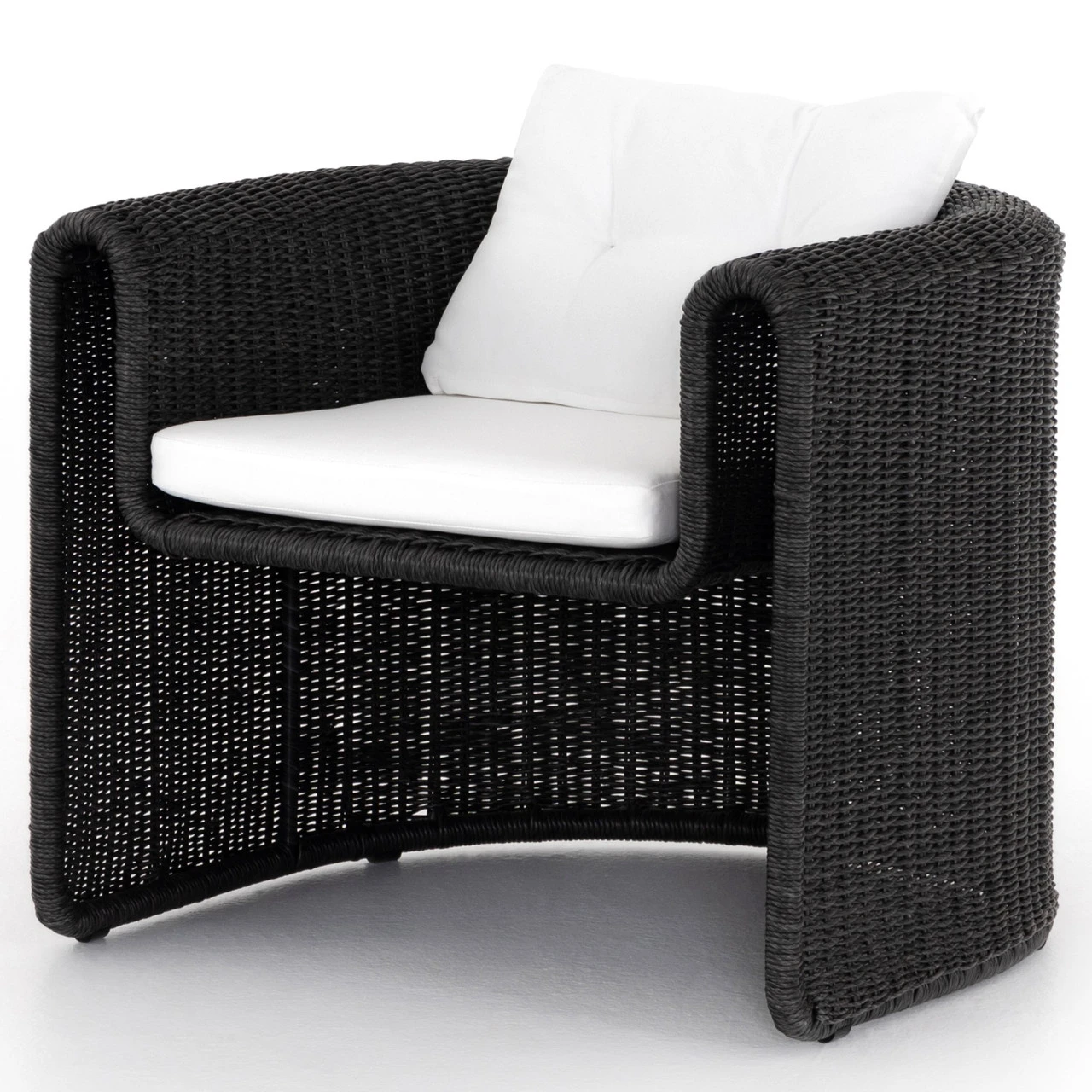A nod to curvy Seventies styling, coal-colored wicker framing forms a fluid, sling-like shape with a waterfall arm, with durable tufted cushioning in a versatile white. Cover or store indoors during inclement weather and when not in use.