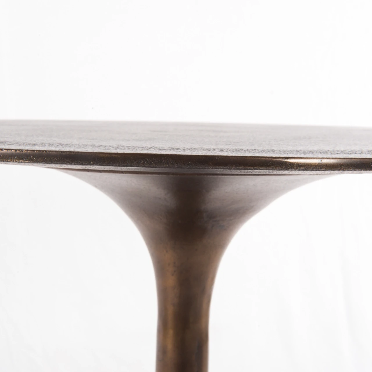 Classic tulip shaping in textural cast-aluminum makes for a modern side table. Finished in antique rust to bring out alluring highs and lows. Great indoors or out — cover or store indoors during inclement weather and when not in use.