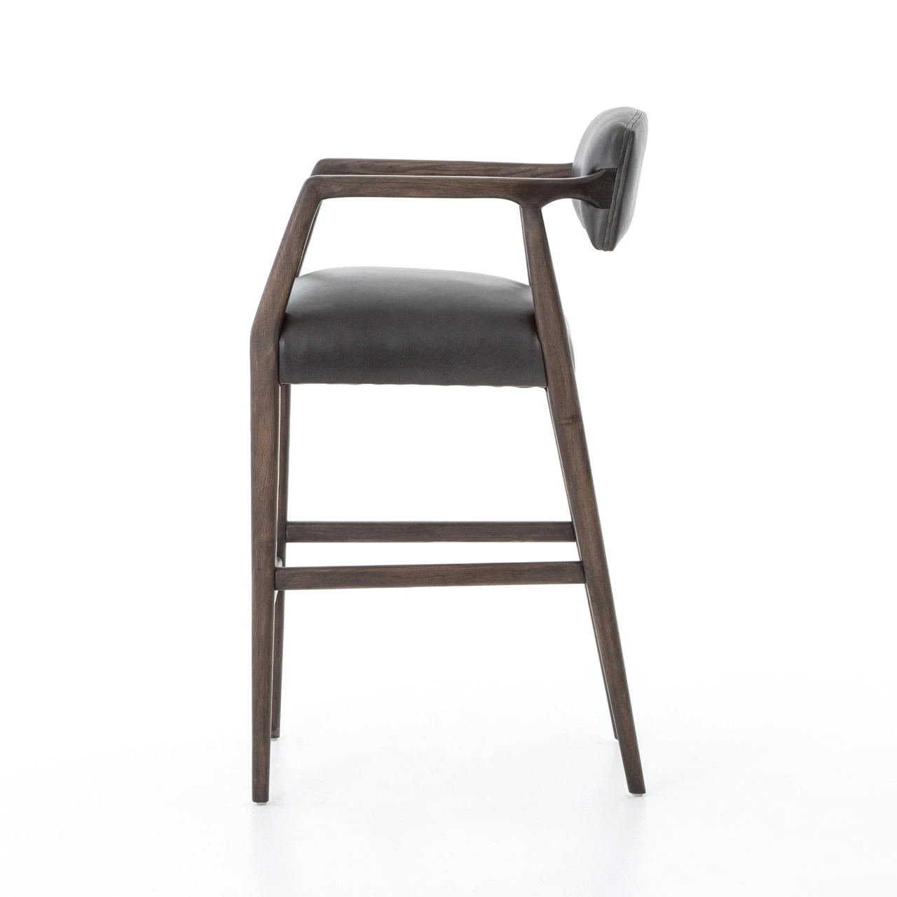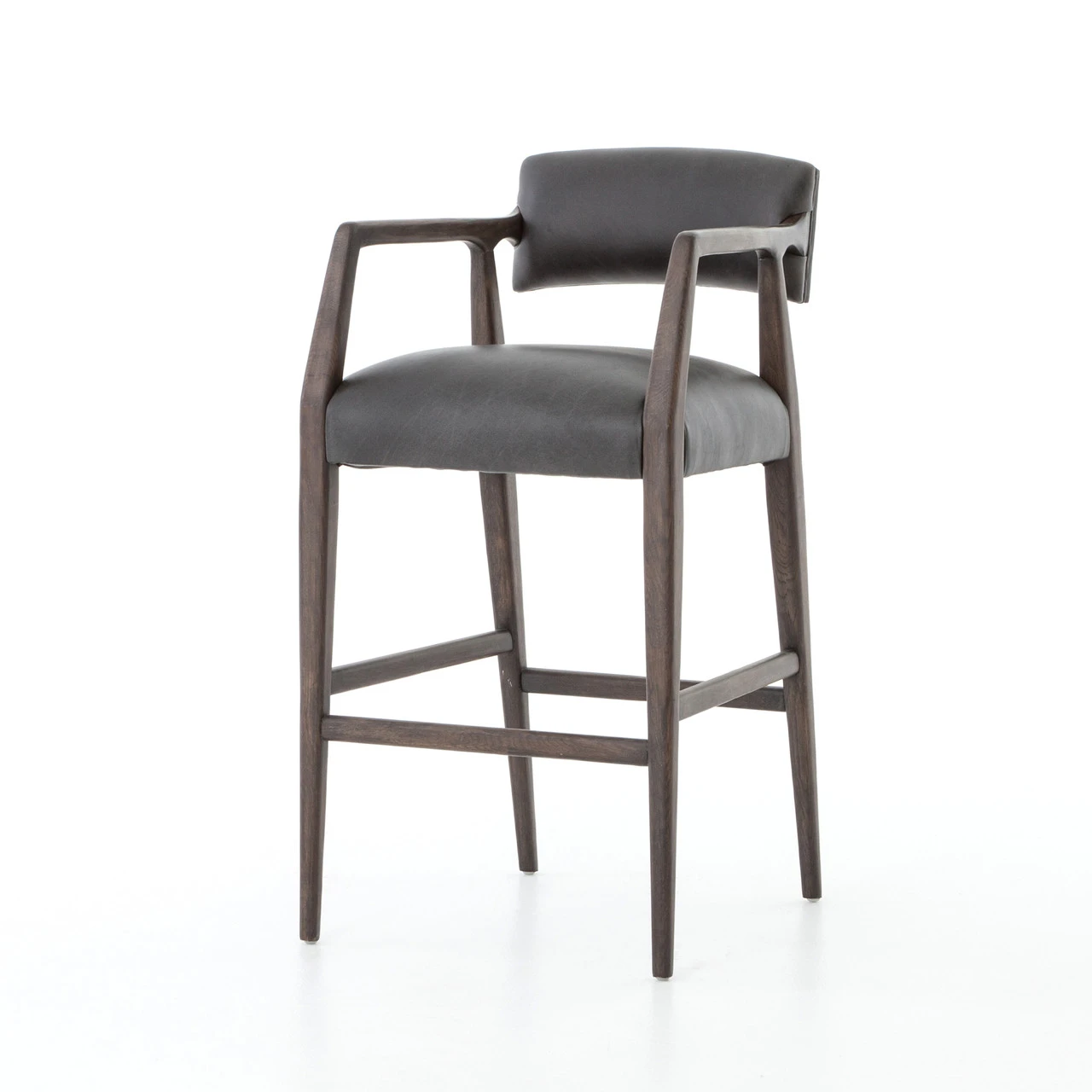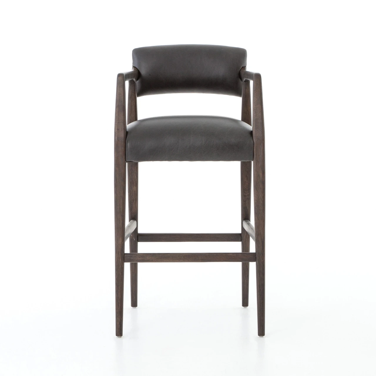 Top-grain leather and artful blends meet exposed wood frames with alluring angles, curves and turns. Architectural lines, exaggerated details and unexpected touches draw the eye with our Tyler Mid-Century Modern Black Leather Bar Stool. Bar seating is styled with an angular, dark and smoky oak frame, a deep seat, and a striking, low-slung back. Covered in black, top-grain leather.