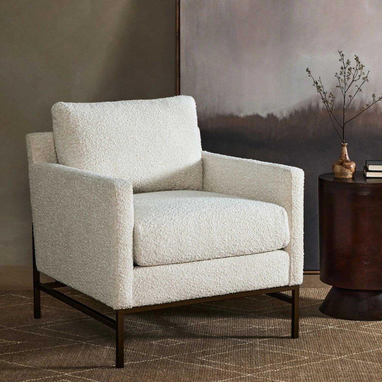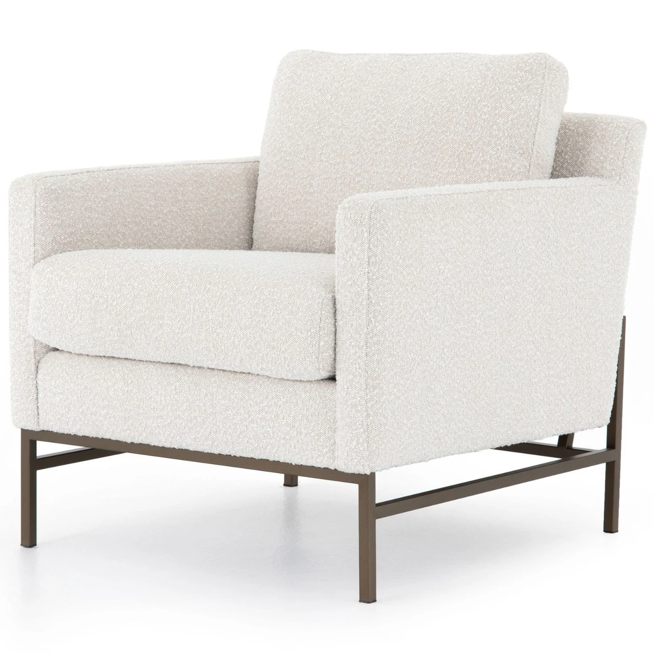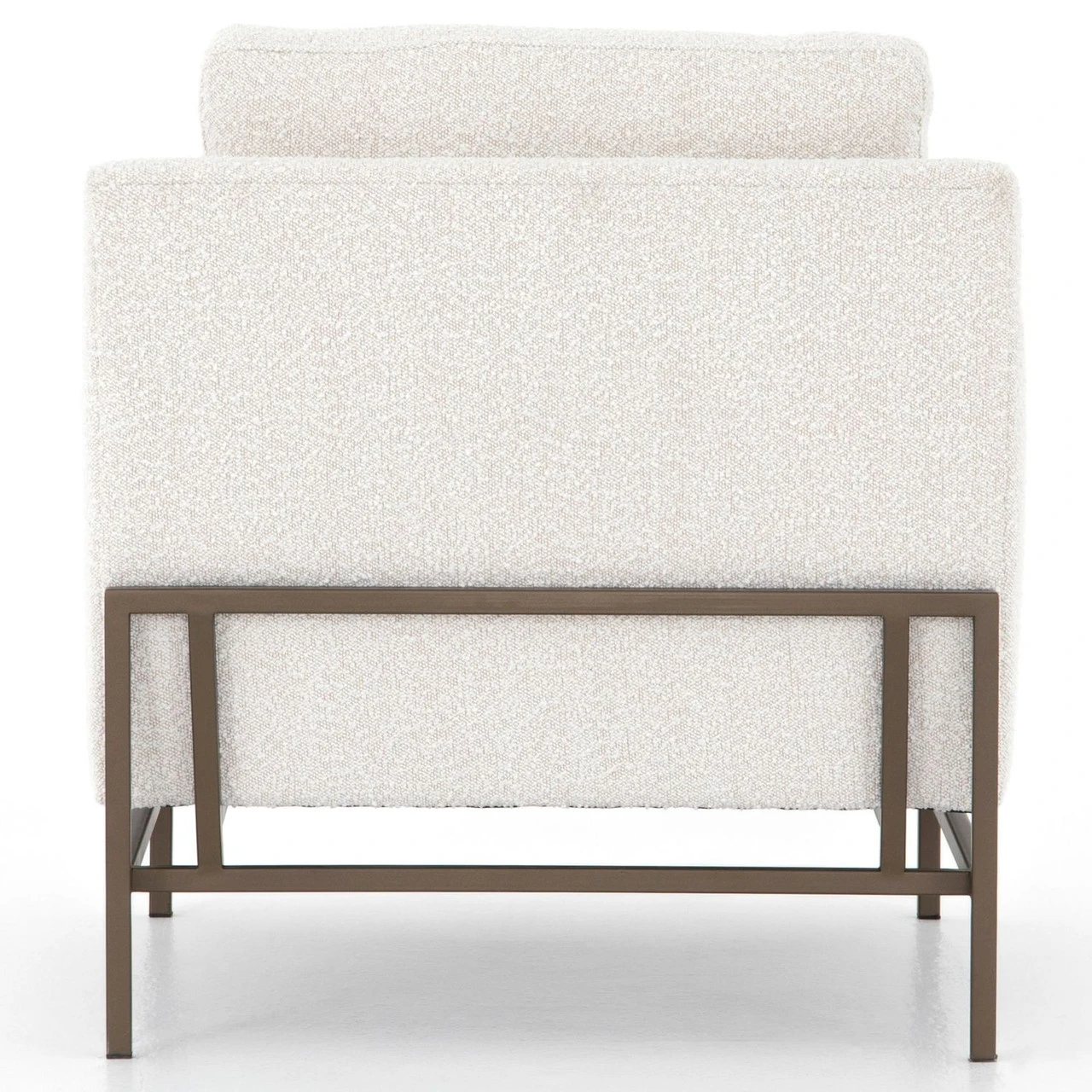Plush and modern-minded. Atop an airy, bronze-finished iron base, thick, boucle-like upholstery features clean, angular track arms and comfy cushioning, for the best of both worlds. Performance fabrics are specially created to withstand spills, stains, high traffic and wear, ensuring long-term comfort and unmatched durability.