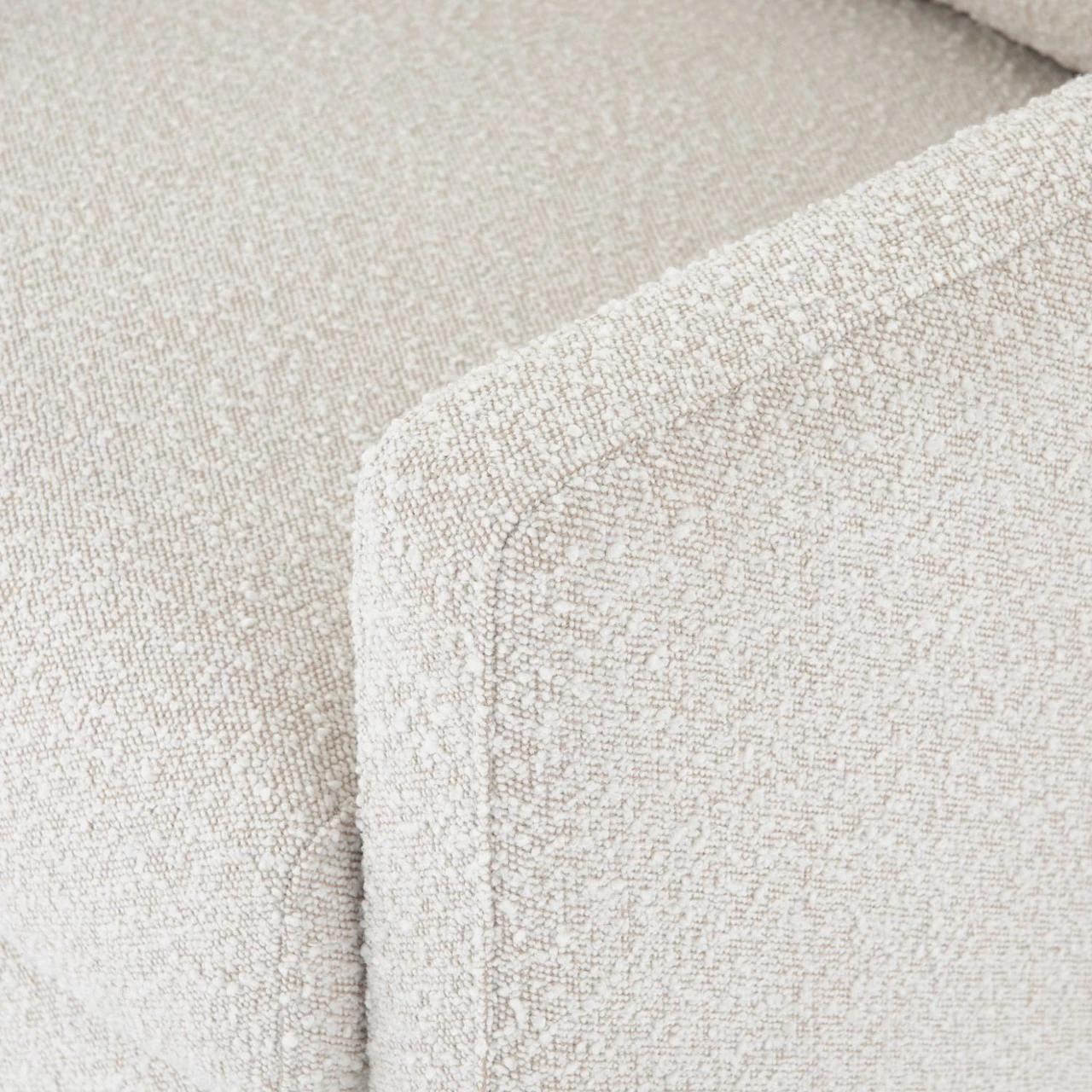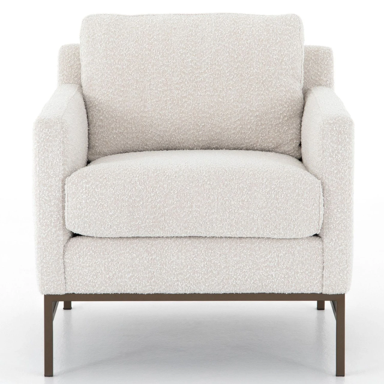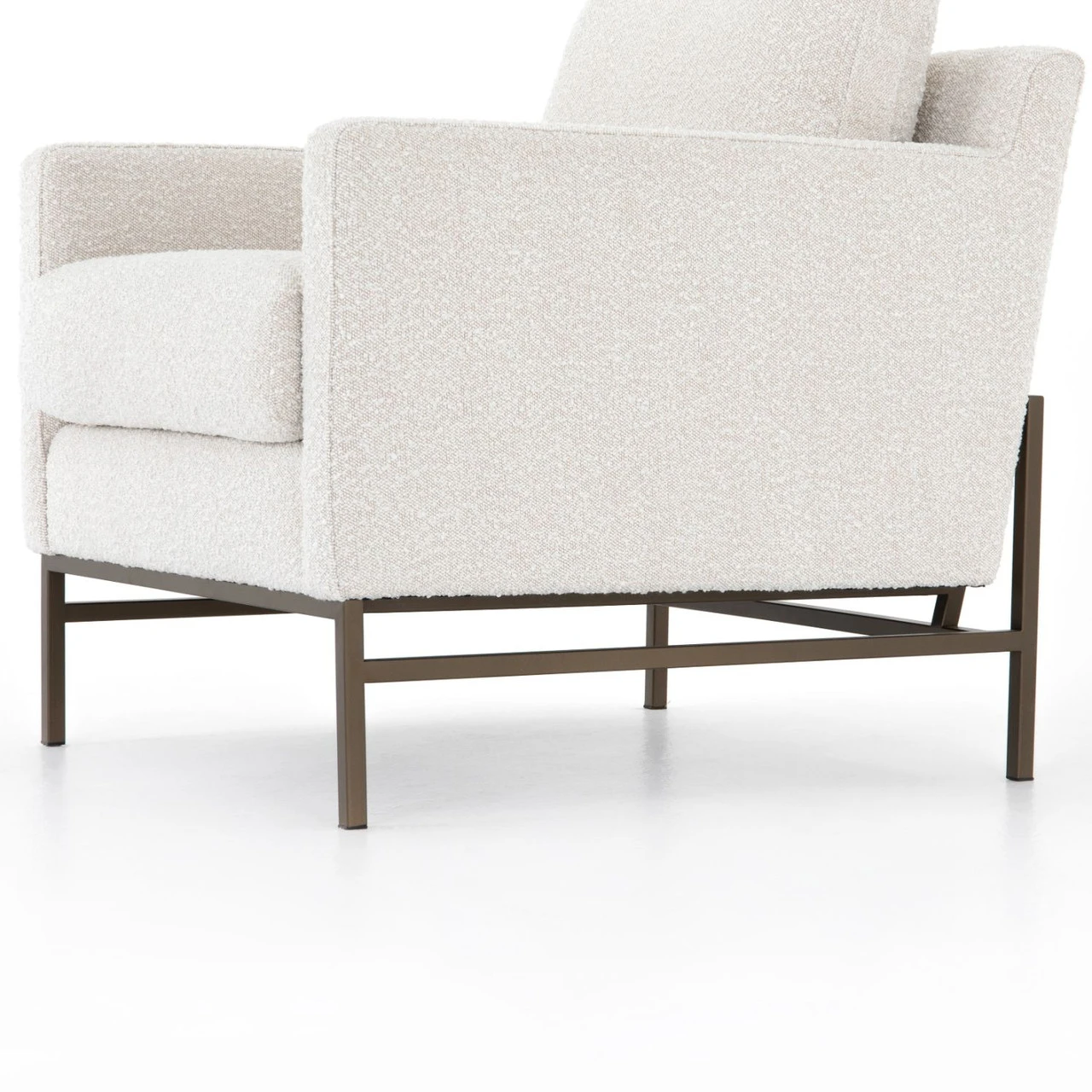 Plush and modern-minded. Atop an airy, bronze-finished iron base, thick, boucle-like upholstery features clean, angular track arms and comfy cushioning, for the best of both worlds. Performance fabrics are specially created to withstand spills, stains, high traffic and wear, ensuring long-term comfort and unmatched durability.
