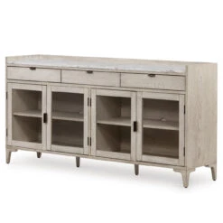 Light and airy, with plenty of presence. Vintage white oak is finished with a dry hand for a light look, while a white Italian marble top offers a sophisticated take on traditional styling. Three top drawers plus spacious interior shelving serving the perfect place for dining storage and display.