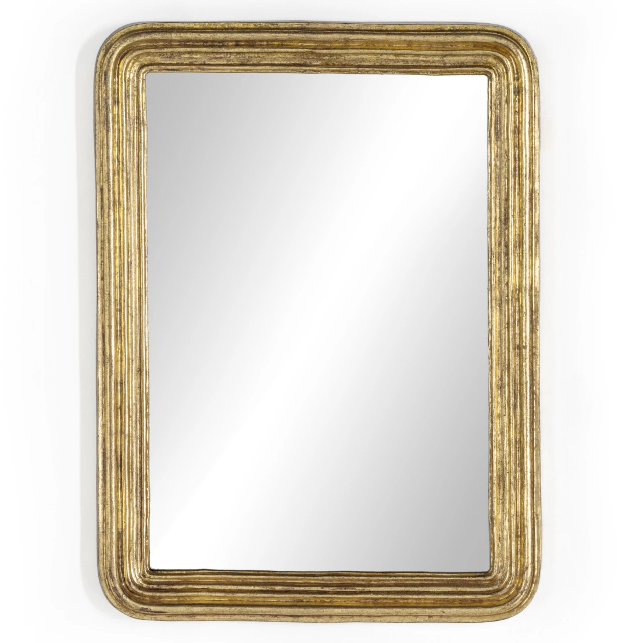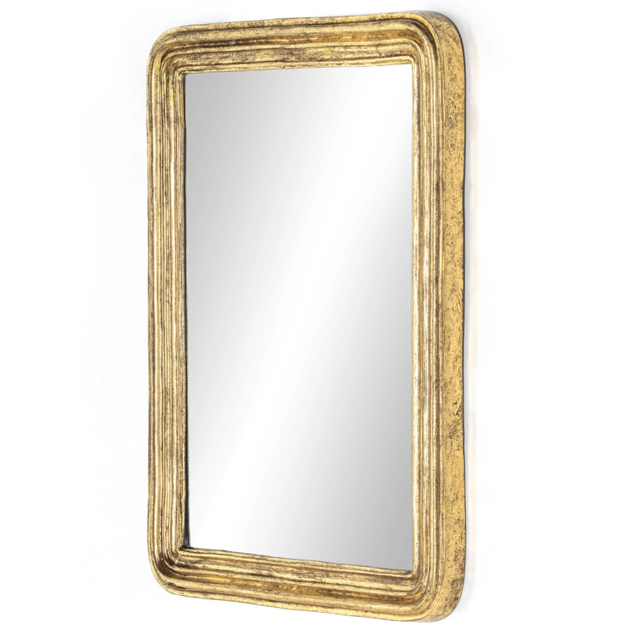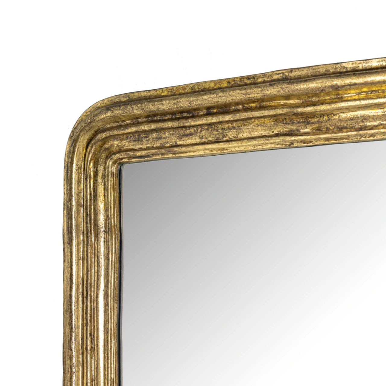 An art deco-inspired statement piece. An aged-gold leaf finish brings a vintage, found look to this large-scale mirror.