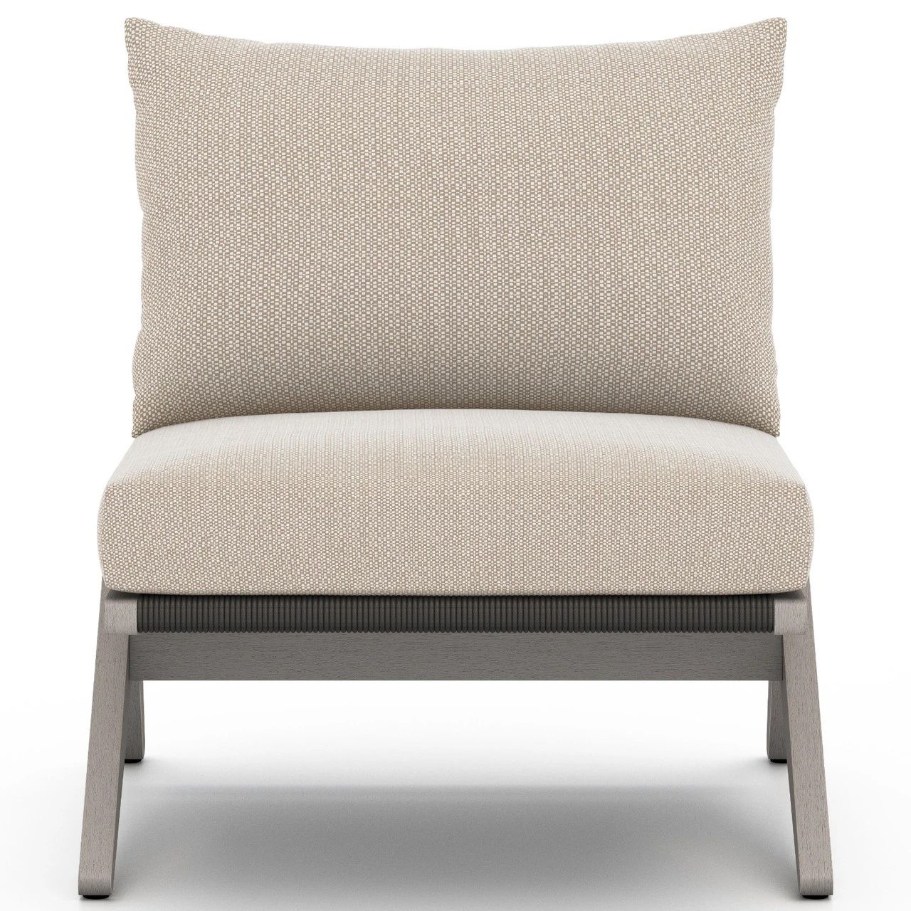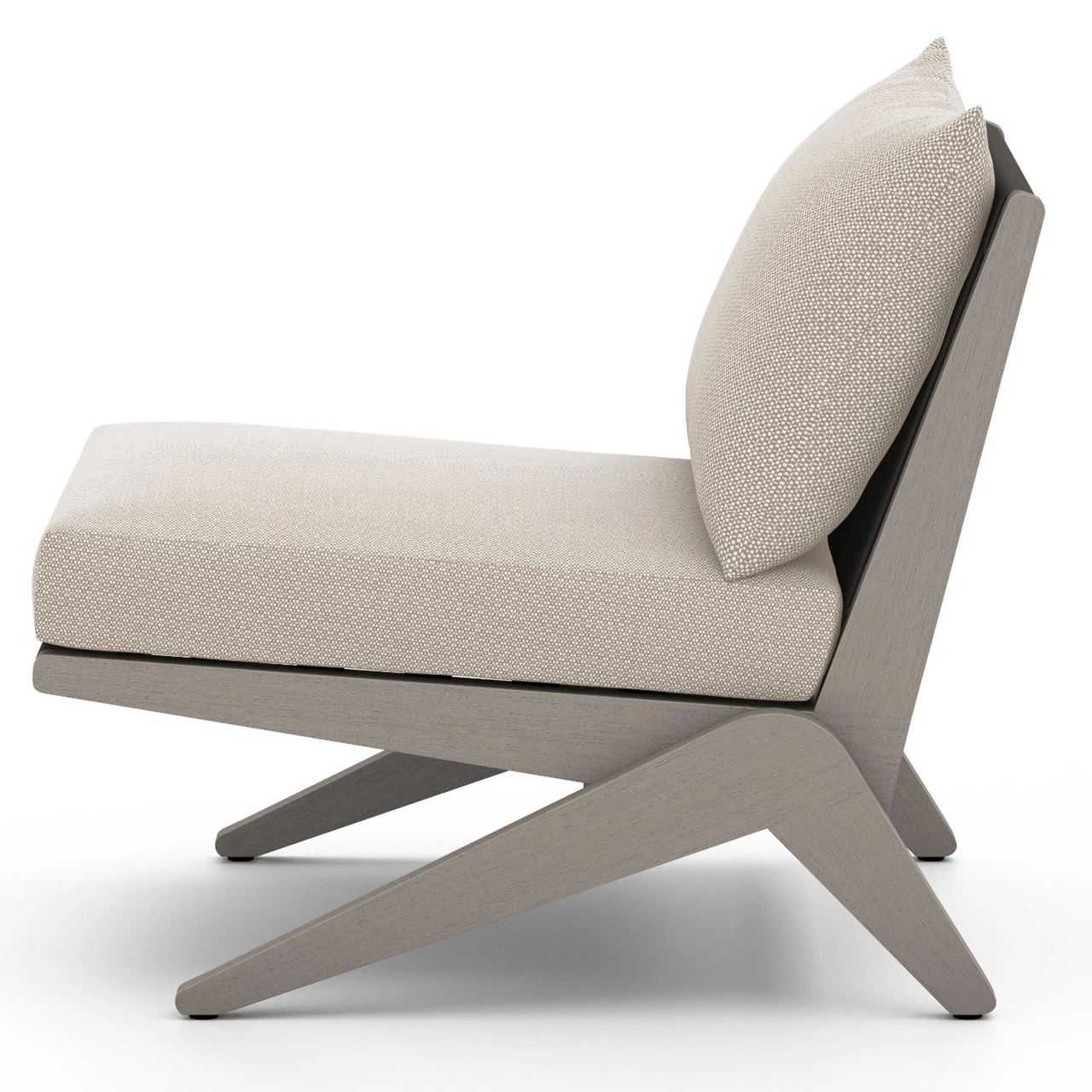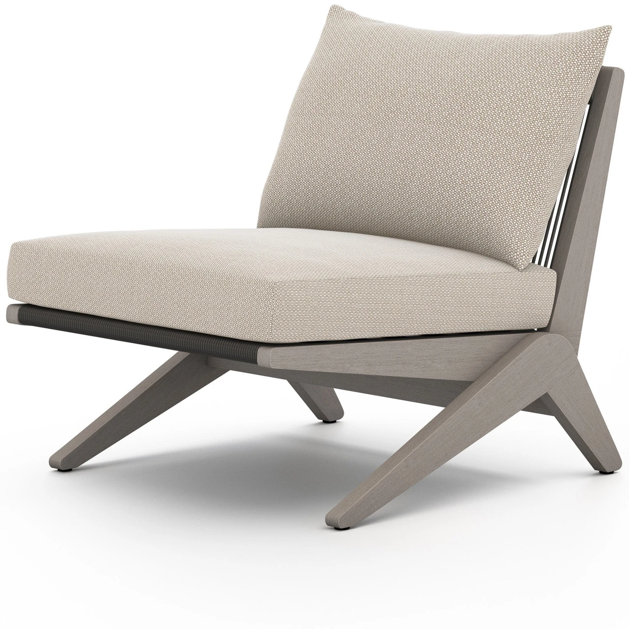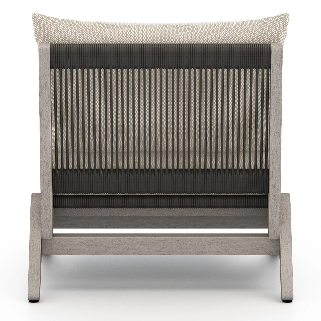 Inspired by Swiss architect Pierre Jeanneret, grey-finished FSC-certified teak forms an angled-leg frame for outdoor-friendly seating in a versatile sandy tan. Rear woven rope adds a touch of texture, while a knife-edge pillow makes for a tailored takeaway. Cover or store indoors during inclement weather and when not in use.