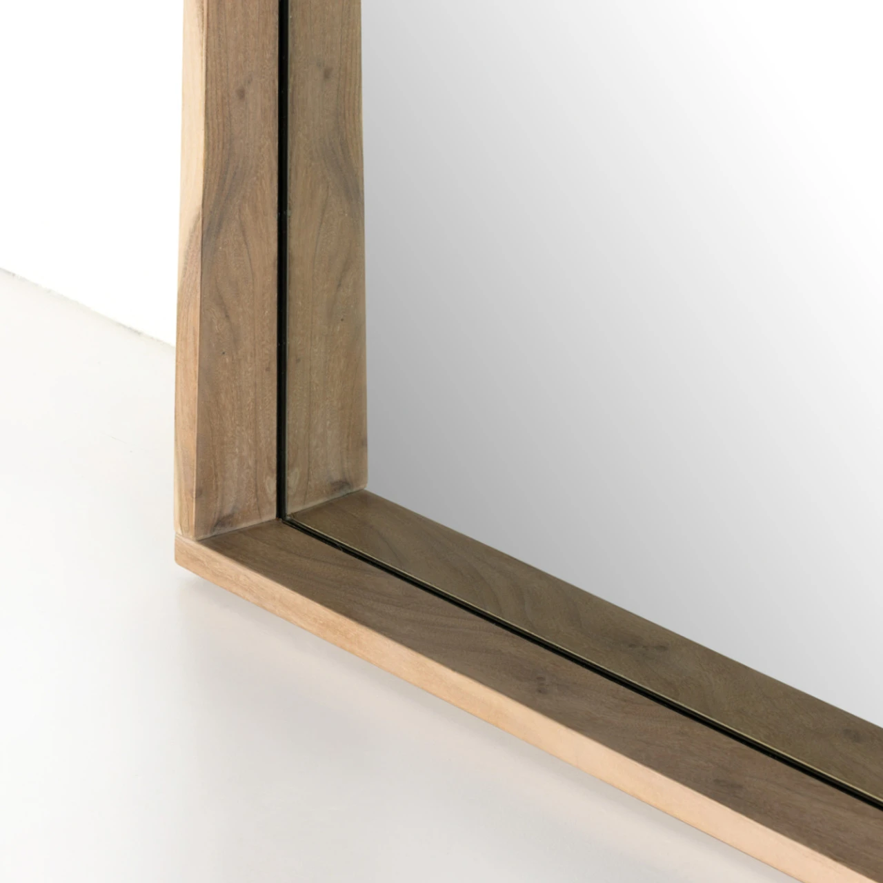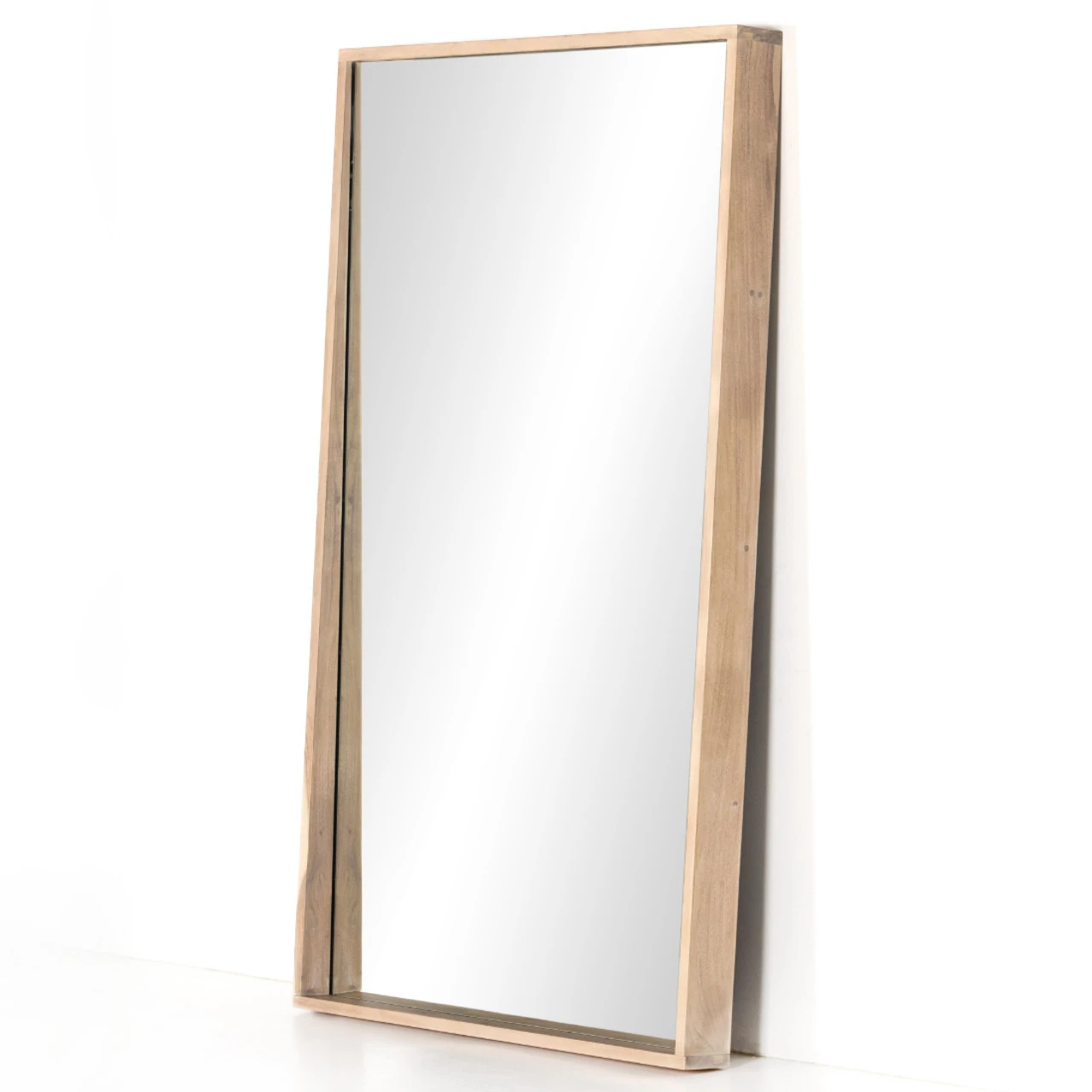 Stylish at any angle. A simple wooden box frame holds a floor-length mirror at a subtle angle that keeps the mirror perpendicular to the floor.