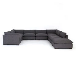 Lounge in ultimate comfort on this fabulous deep-seat sectional. This 8-piece corner U-shaped Modular sectional sofa, made up of five individual chairs, features super-deep, low seats and super-soft back cushions that invite family to pile on and sink in. Bennett Charcoal color knife edge cushioning is upholstered in luxuriously durable and family-friendly 100% polyester, perfect for modern living. The Westwood Modern Bennett Charcoal 8-Piece U-Shape Sectional Sofa is a Zin Home favorite and it will be the focal point in any living room decor.