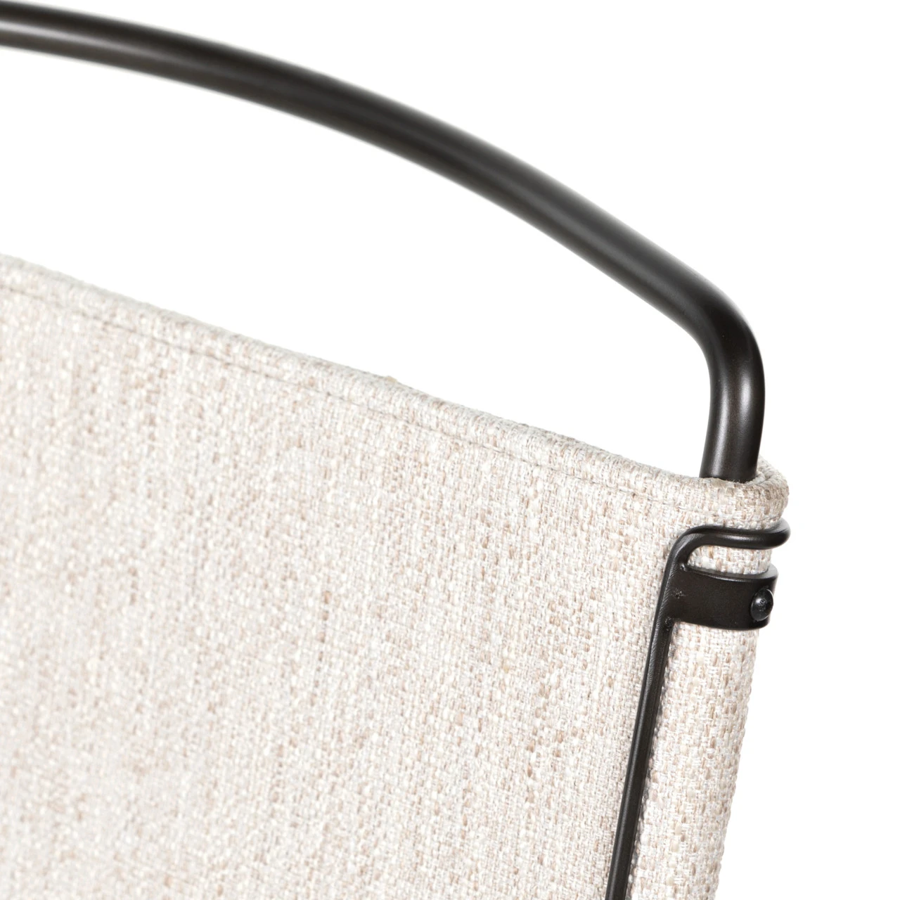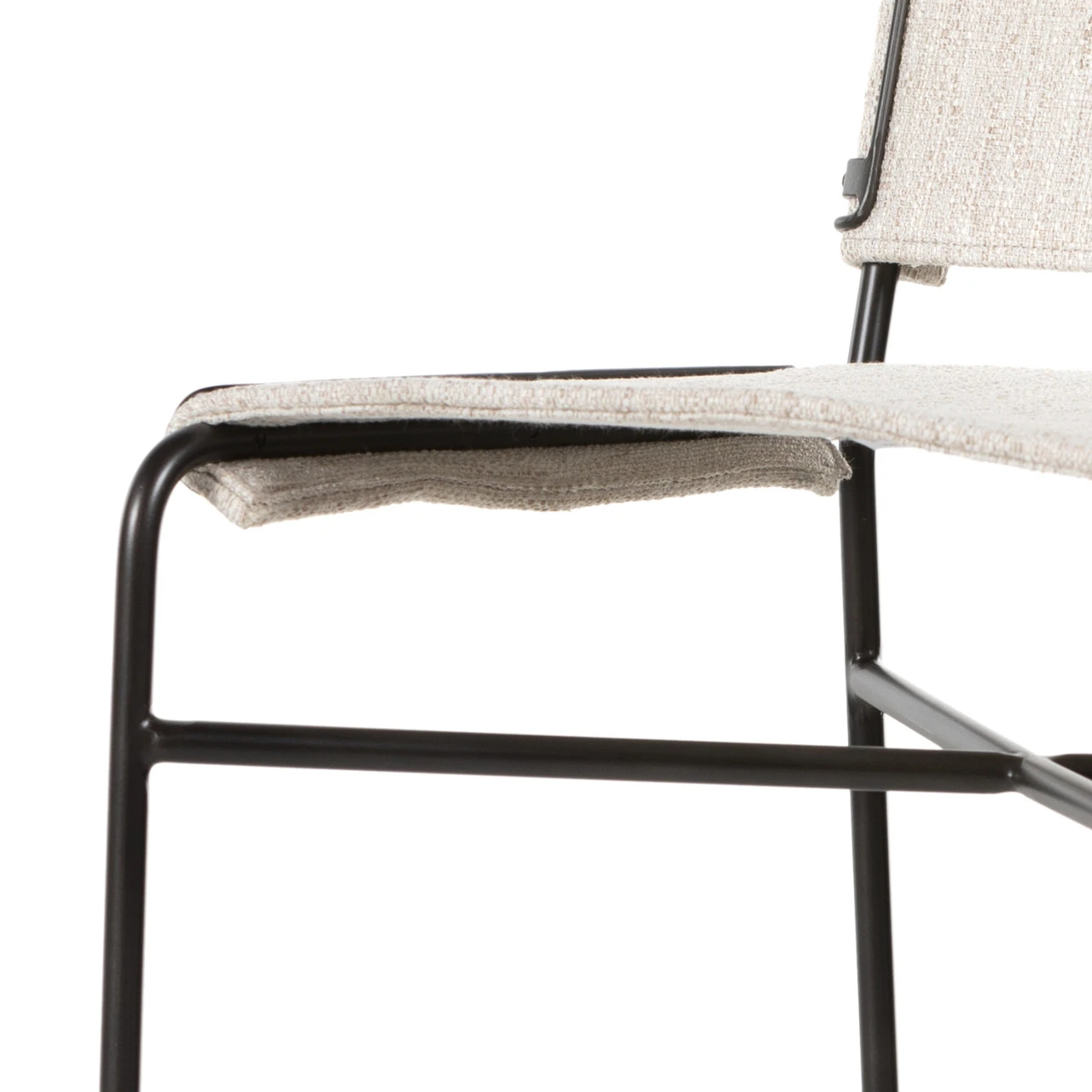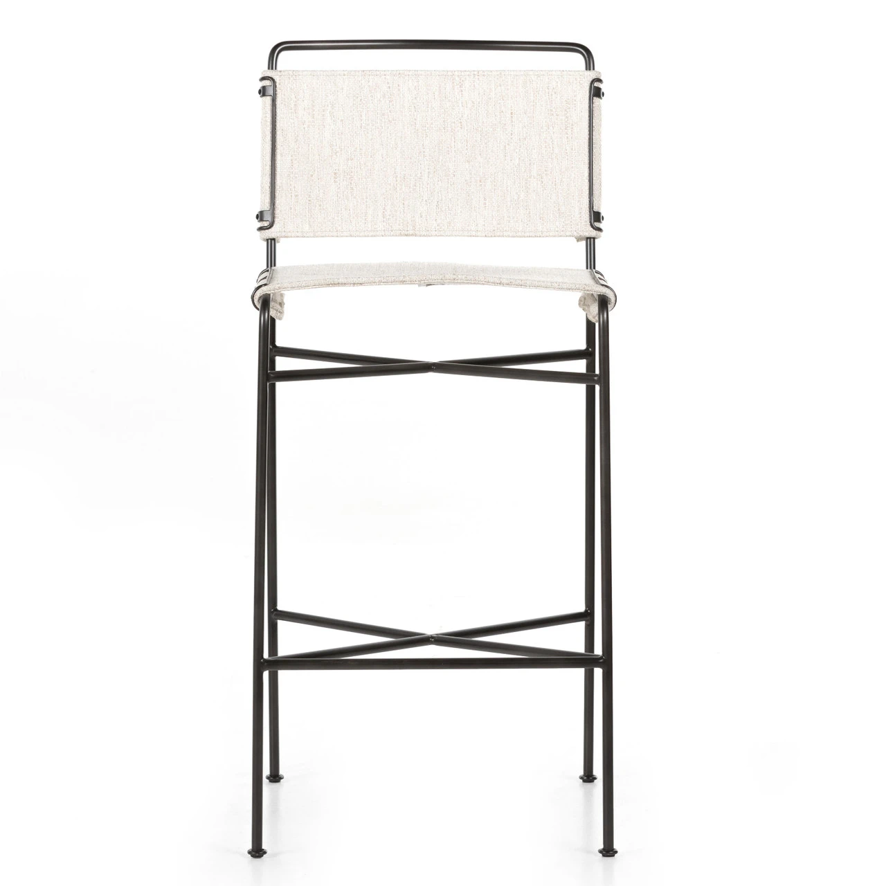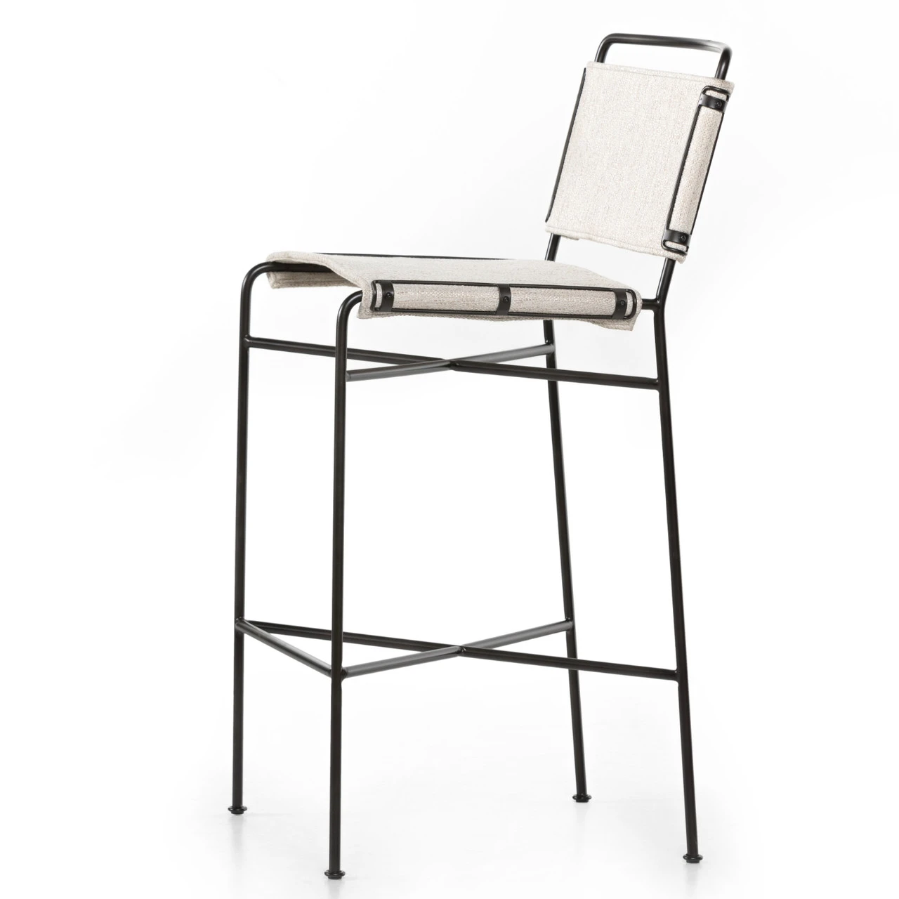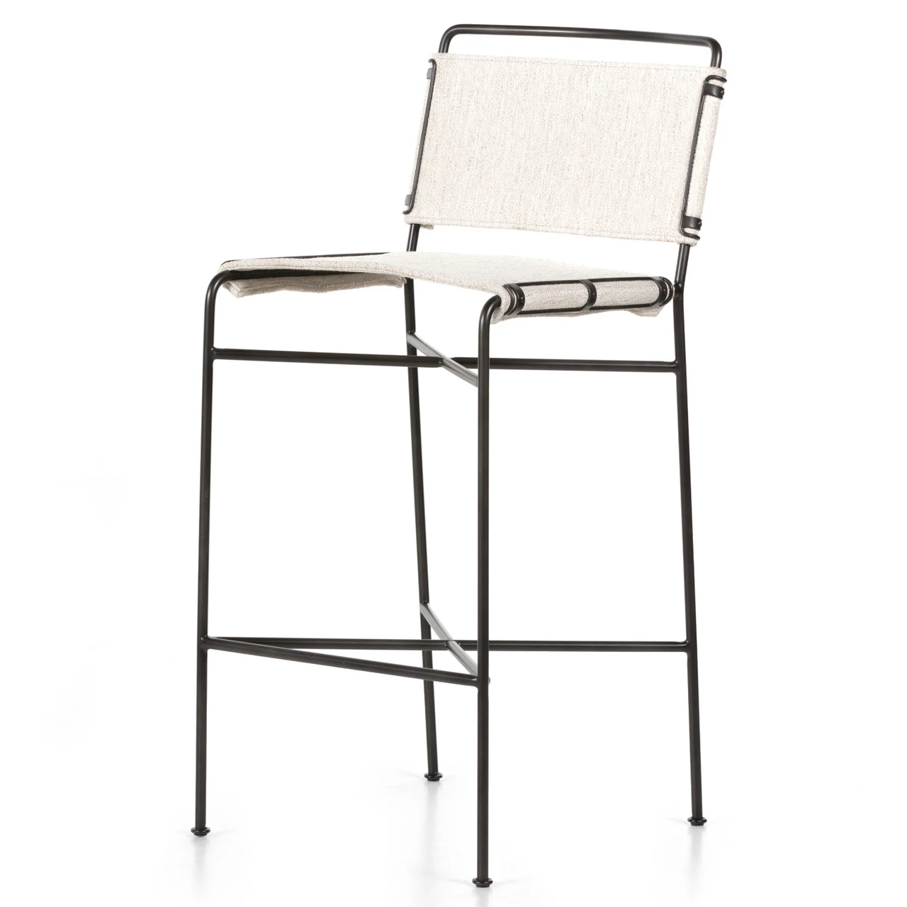 Slim lines and mixed materials combine for ample bar comfort. Finished in a waxed jet black, architecturally inspired iron tubing is graced by simply contoured cotton seating in a versatile off-white.
