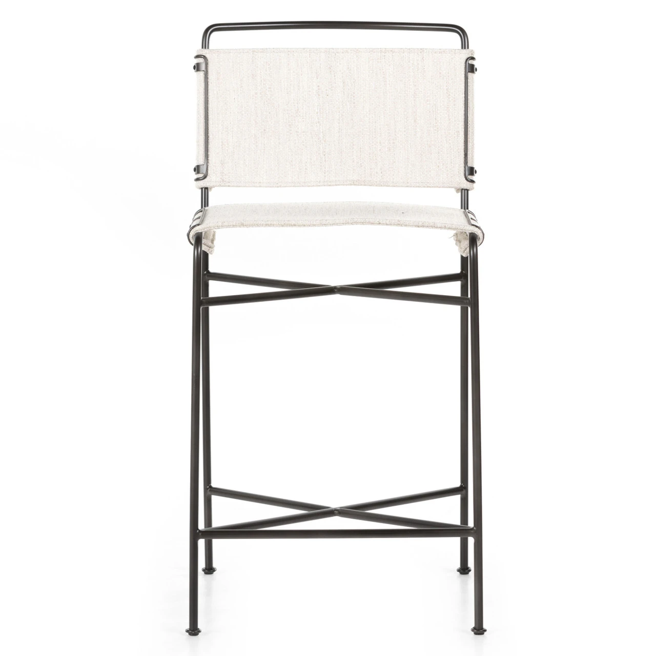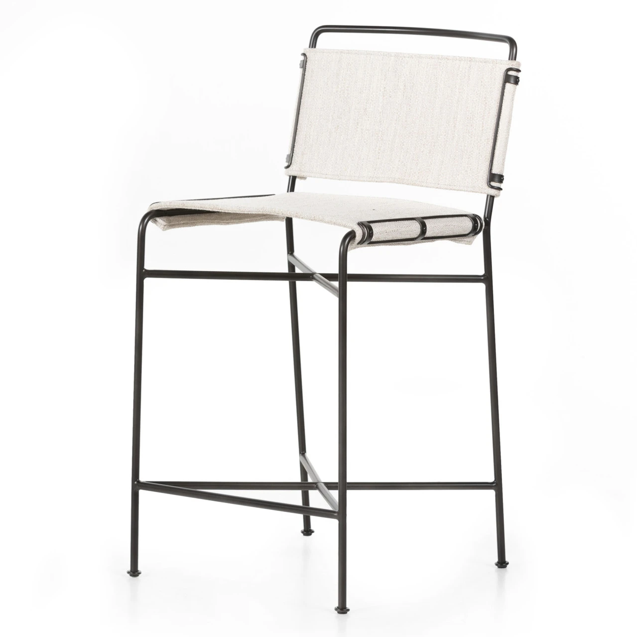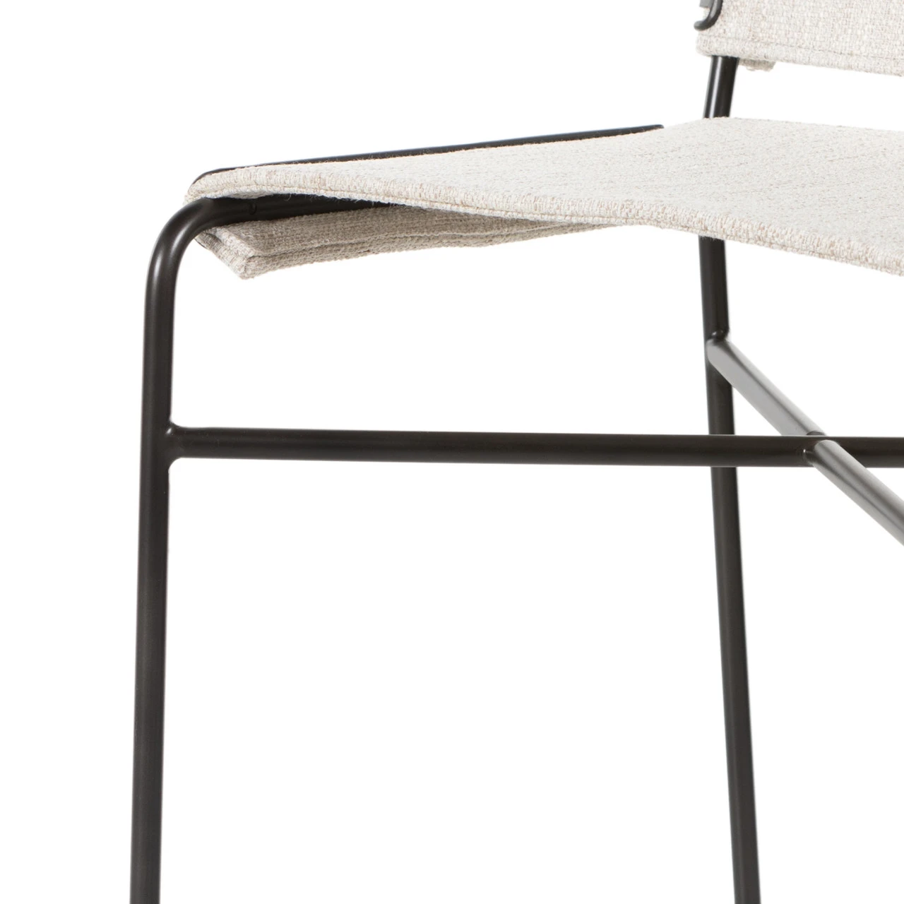Slim lines and mixed materials combine for ample counter comfort. Finished in a waxed jet black, architecturally inspired iron tubing is graced by simply contoured cotton seating in a versatile off-white.