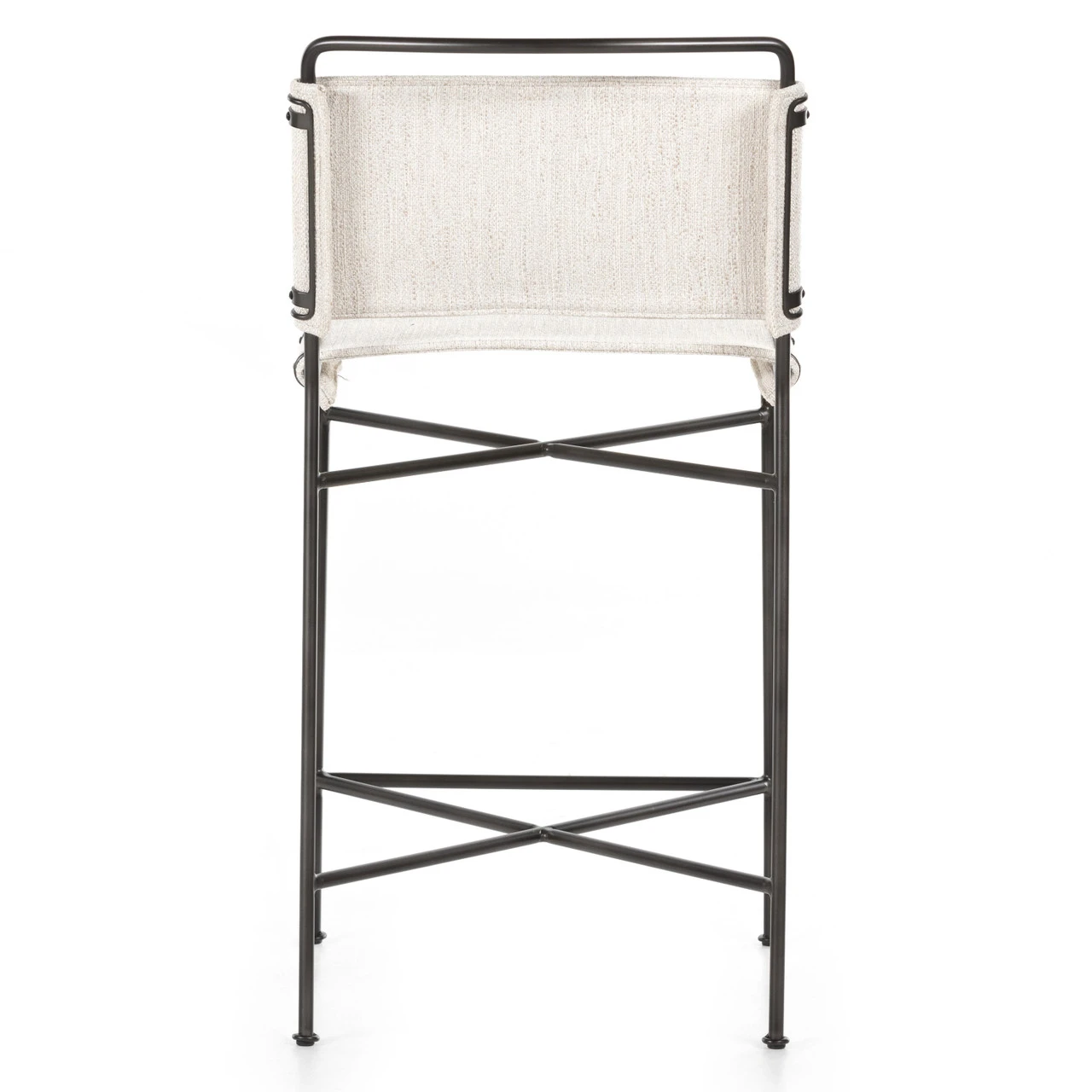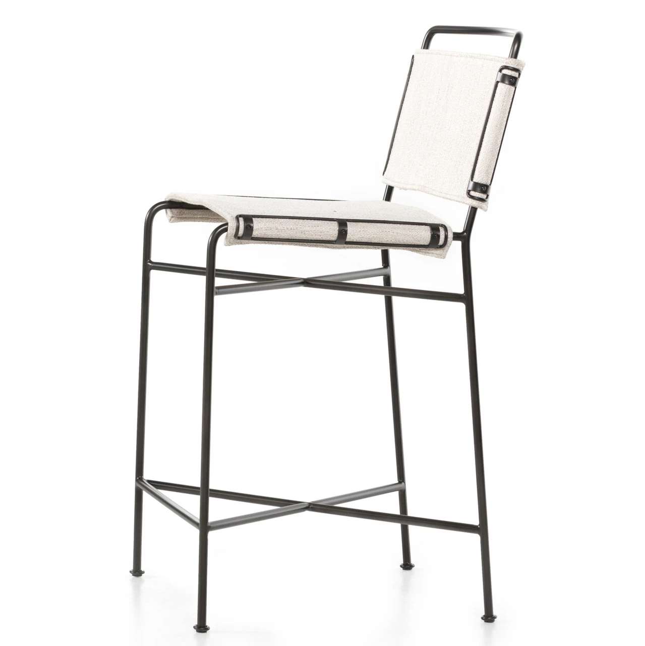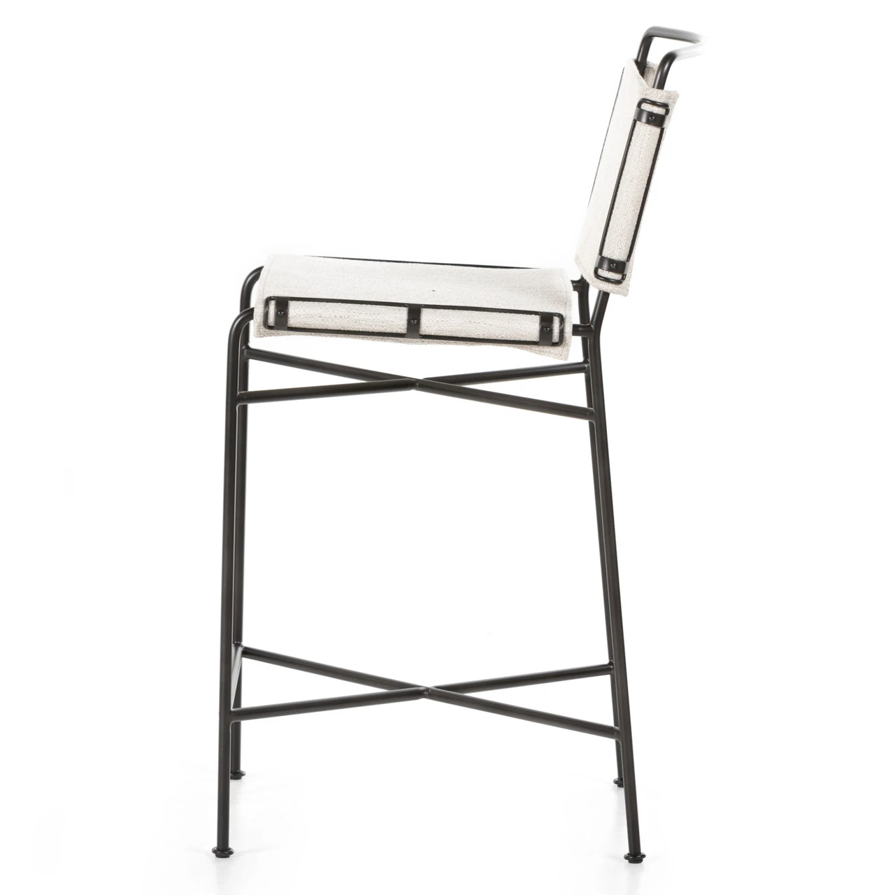 Slim lines and mixed materials combine for ample counter comfort. Finished in a waxed jet black, architecturally inspired iron tubing is graced by simply contoured cotton seating in a versatile off-white.