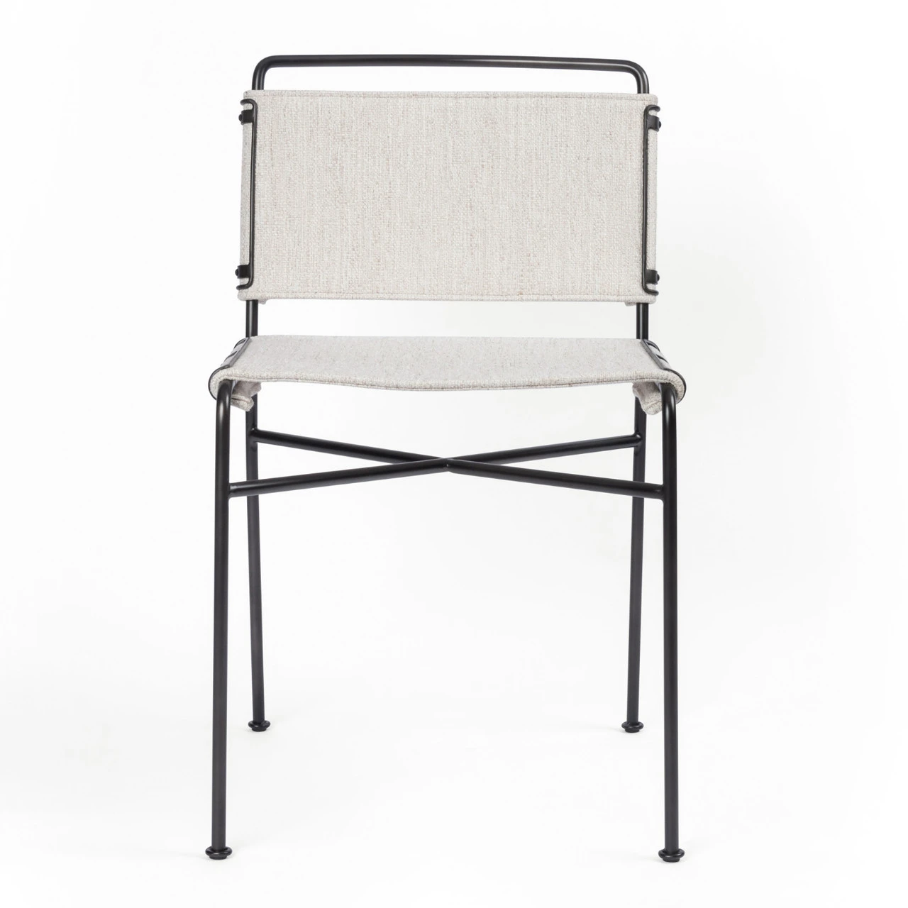 Slim lines meet mixed materials for style and comfort alike. Finished in a waxed black, architecturally inspired iron framing is graced by sleek, simply contoured seating in an invitingly neutral hue.