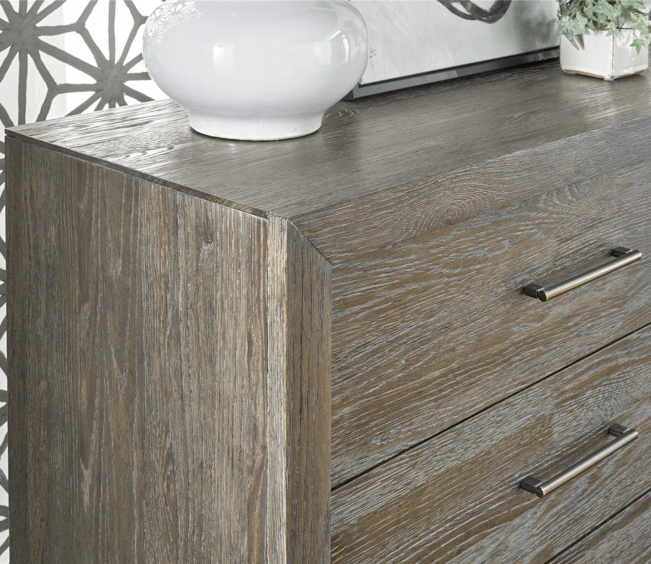 Wilshire Modern Oak Wood 8 Drawer Double Dresser is sophisticated, clean and simple, bold and a bit daring. It honors its roots in Modernism but has been adapted for today’s life and activities, in action and rest. Antiqued bronze metal drawer pulls are a striking counterpoint to the naturally rich grain of quartered oak wood. Our Modern Gray Oak Wooden Dressers feature English dovetail drawer construction, stained and sealed wood drawer sides, metal ball bearing side guides and cedar drawer bottom and a jewelry tray.
