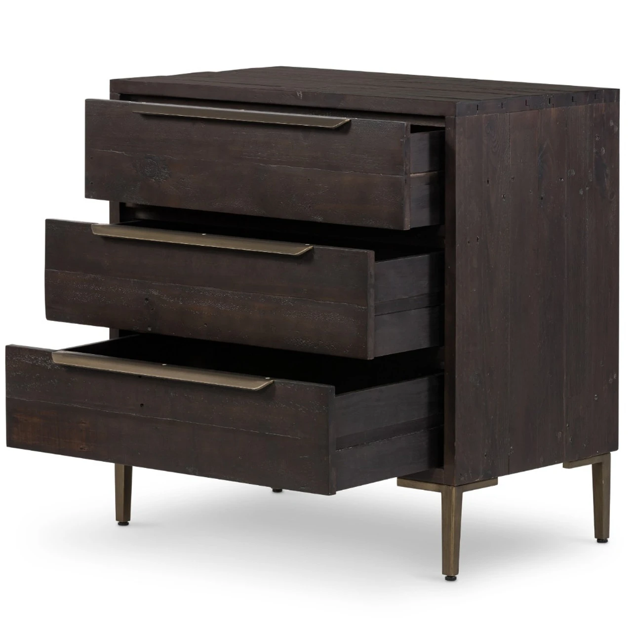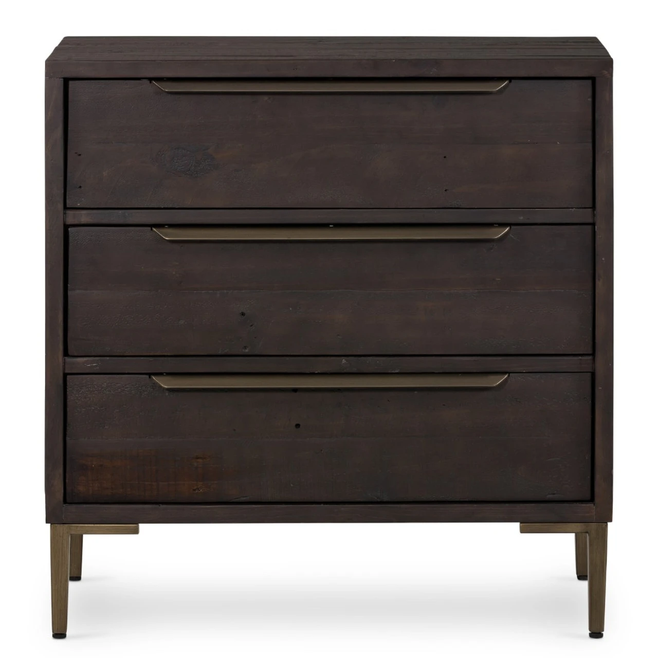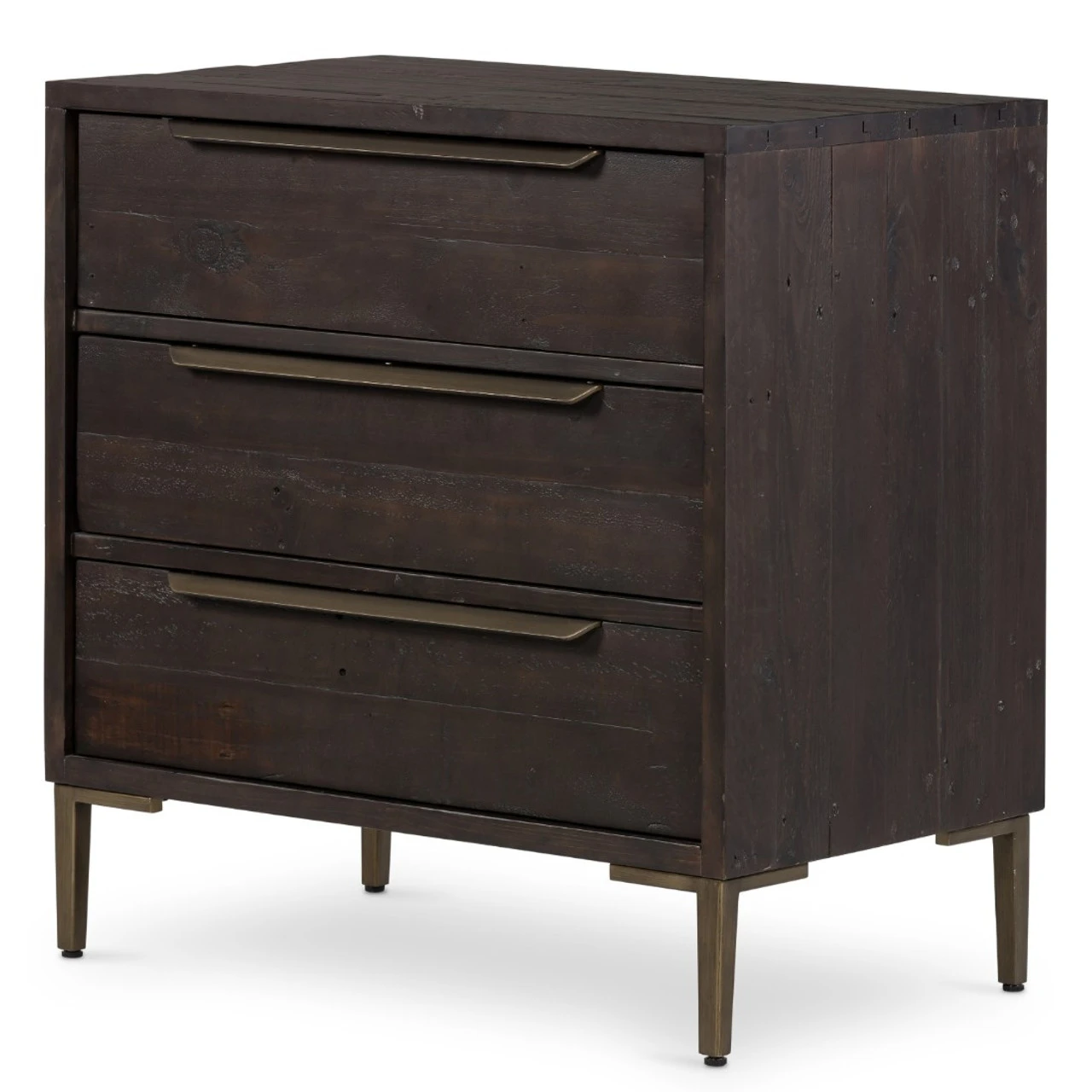 Reclaimed pine takes on a deep carbon tone, letting natural graining emit its innately rich character. Slim legs and flat, antique brass-finished iron hardware place a fresh spin on a streamlined form. Three drawers for ample bedroom storage.