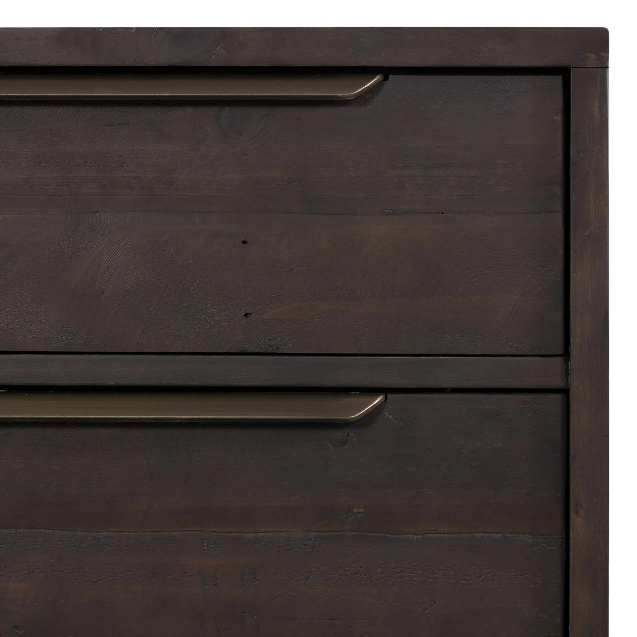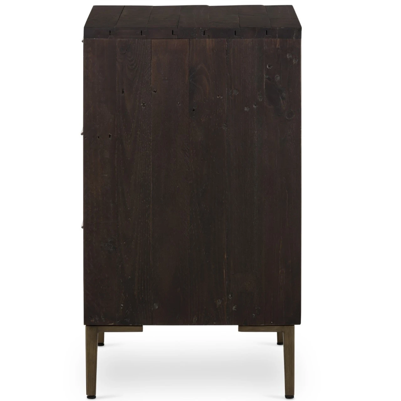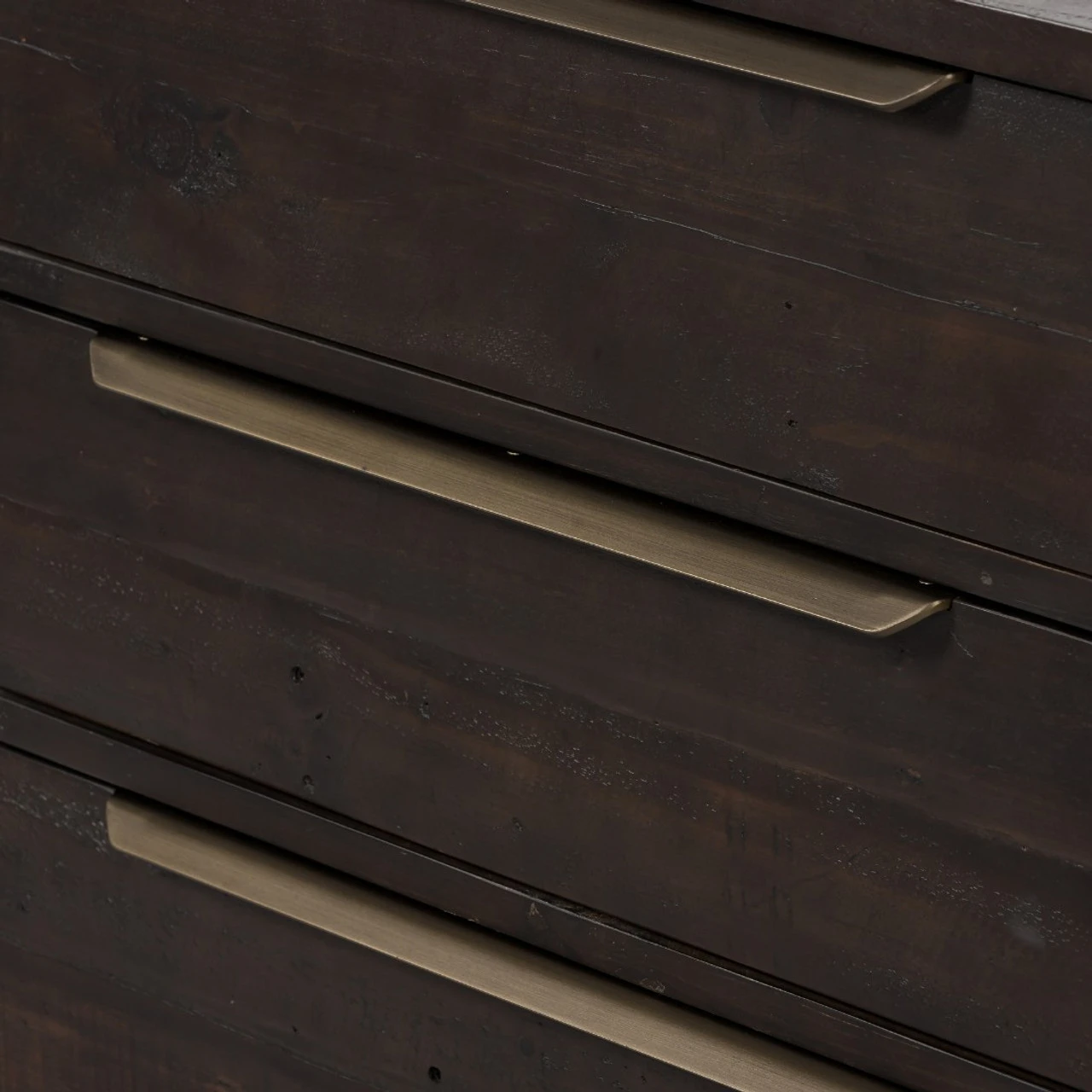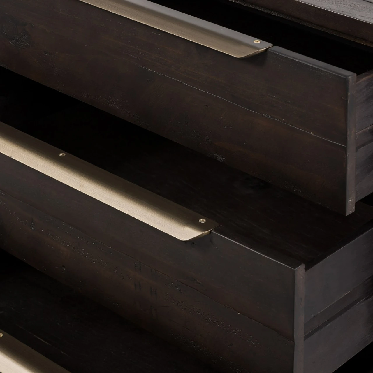 Reclaimed pine takes on a deep carbon tone, letting natural graining emit its innately rich character. Slim legs and flat, antique brass-finished iron hardware place a fresh spin on a streamlined form. Three drawers for ample bedroom storage.